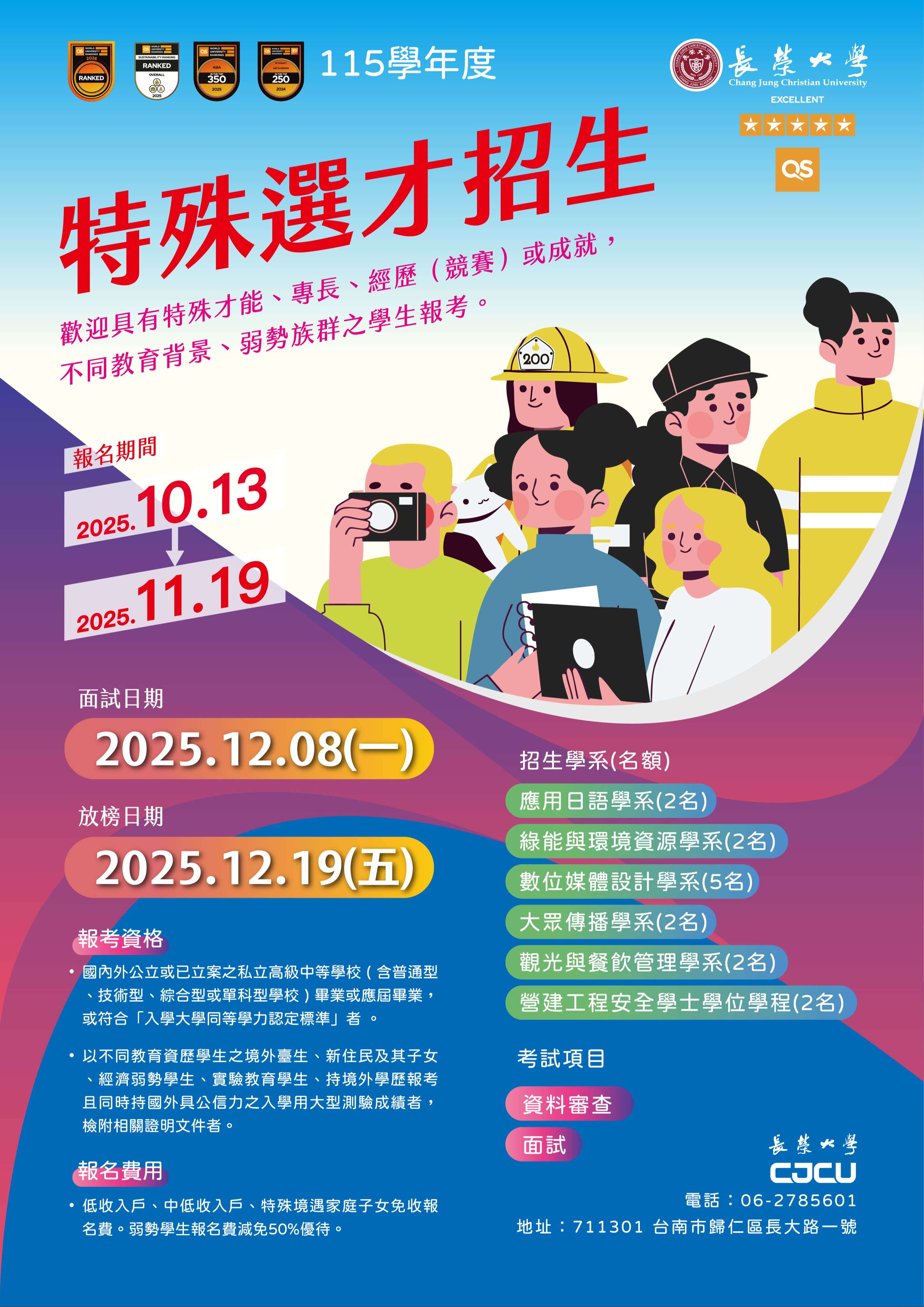 一、本校為鼓勵具特殊才能、專長、經歷(競賽)或成就,不同教育背景及弱勢族群之學生進入大學就讀,特辦理115學年度特殊選才招生。