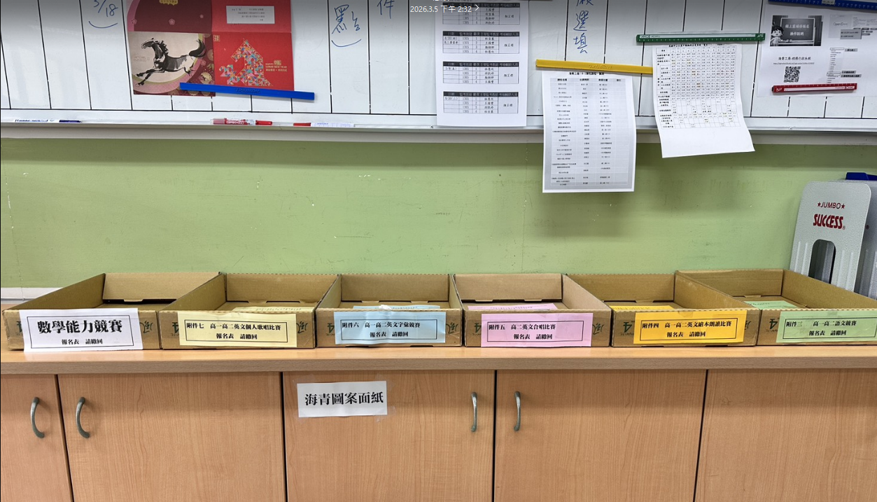 各班學藝股長請於3月20日(五)中午前將班級報名表(附件一) ,含導師及指導老師簽名,繳交至教務處。