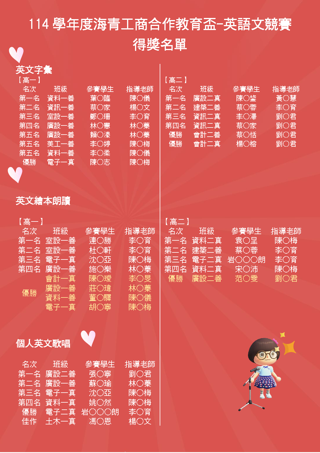 頒獎時間:115年5月6日(三)中午12:30在校長室外走廊集合,頒發獎狀及禮券。