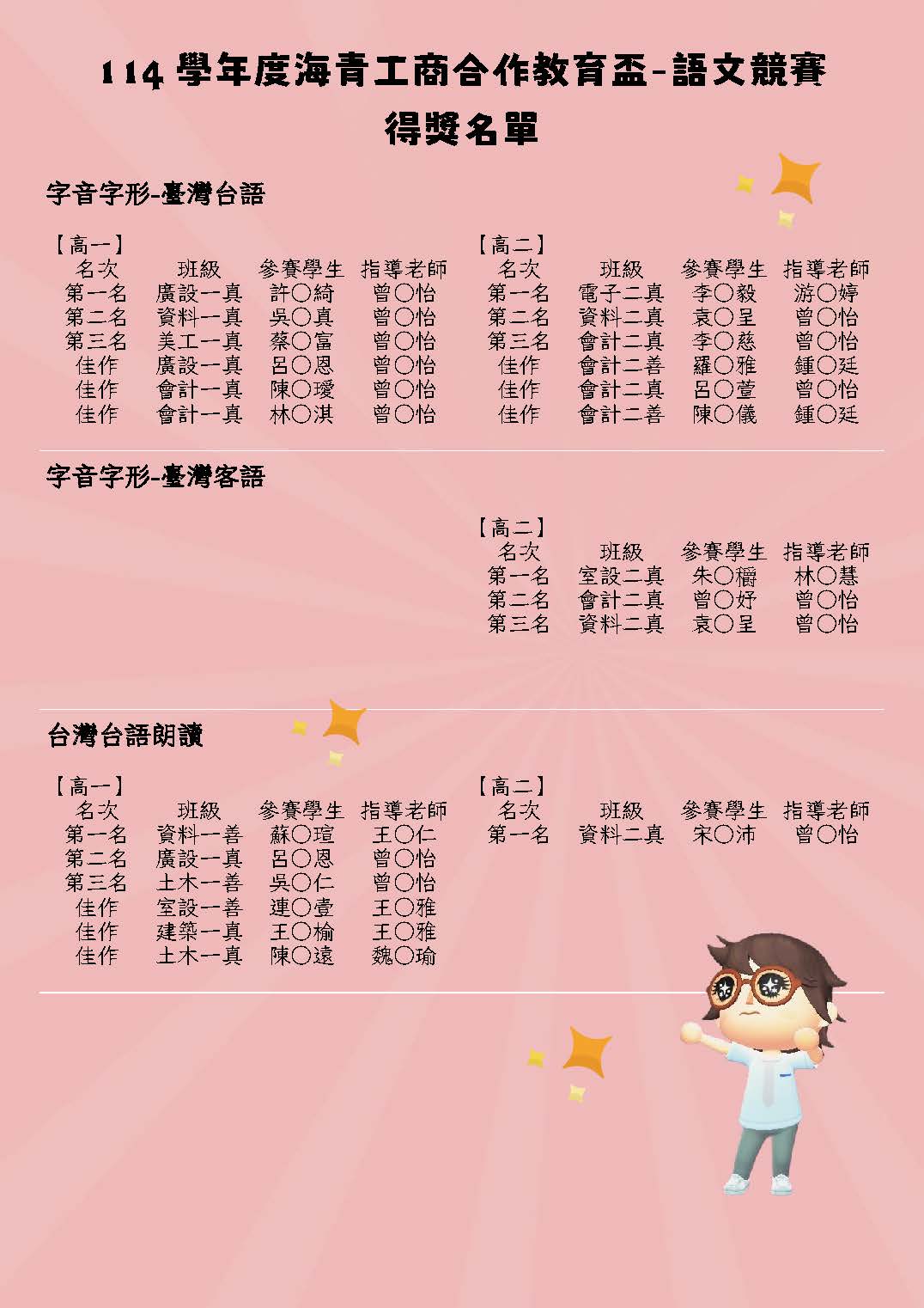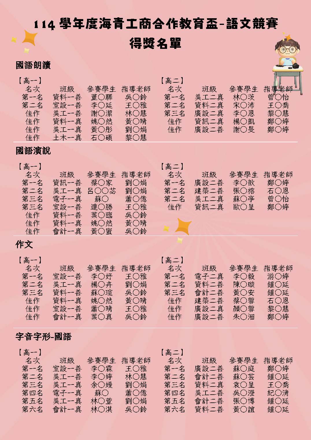 競賽名次同步公告於教務處外公告欄,