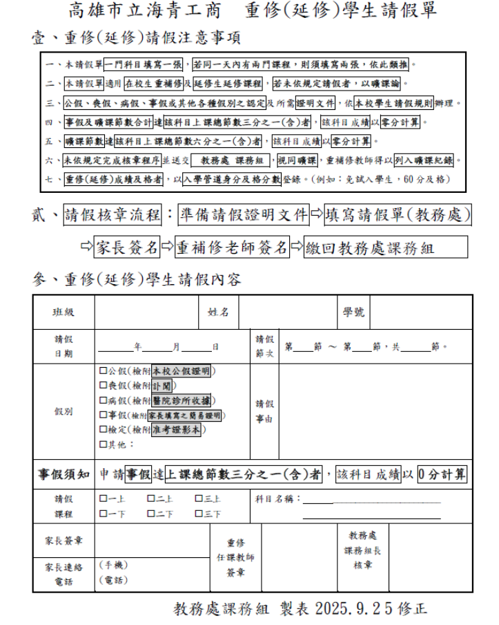 ※請務必注意重補修請假原則。(紙本請假單至教務處課務組領取,不用到合作社購買假卡)