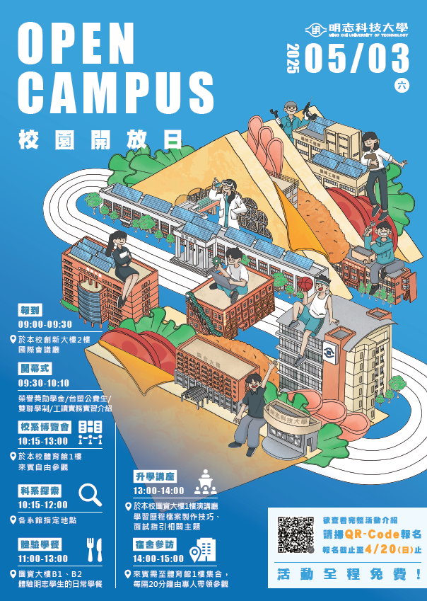 一、本校為台塑企業辦學最悠久之學校,為提供高中職師生更加了解本校,將舉辦「2025校園開放日OPEN CAMPUS」,當日活動不僅有本校特色介紹、開放來賓自由參觀各系、學程及專班,午餐時間提供學生書院餐廳,另辦理升學講座、宿舍導覽,讓來賓體驗校園生活,活動全程免費,詳