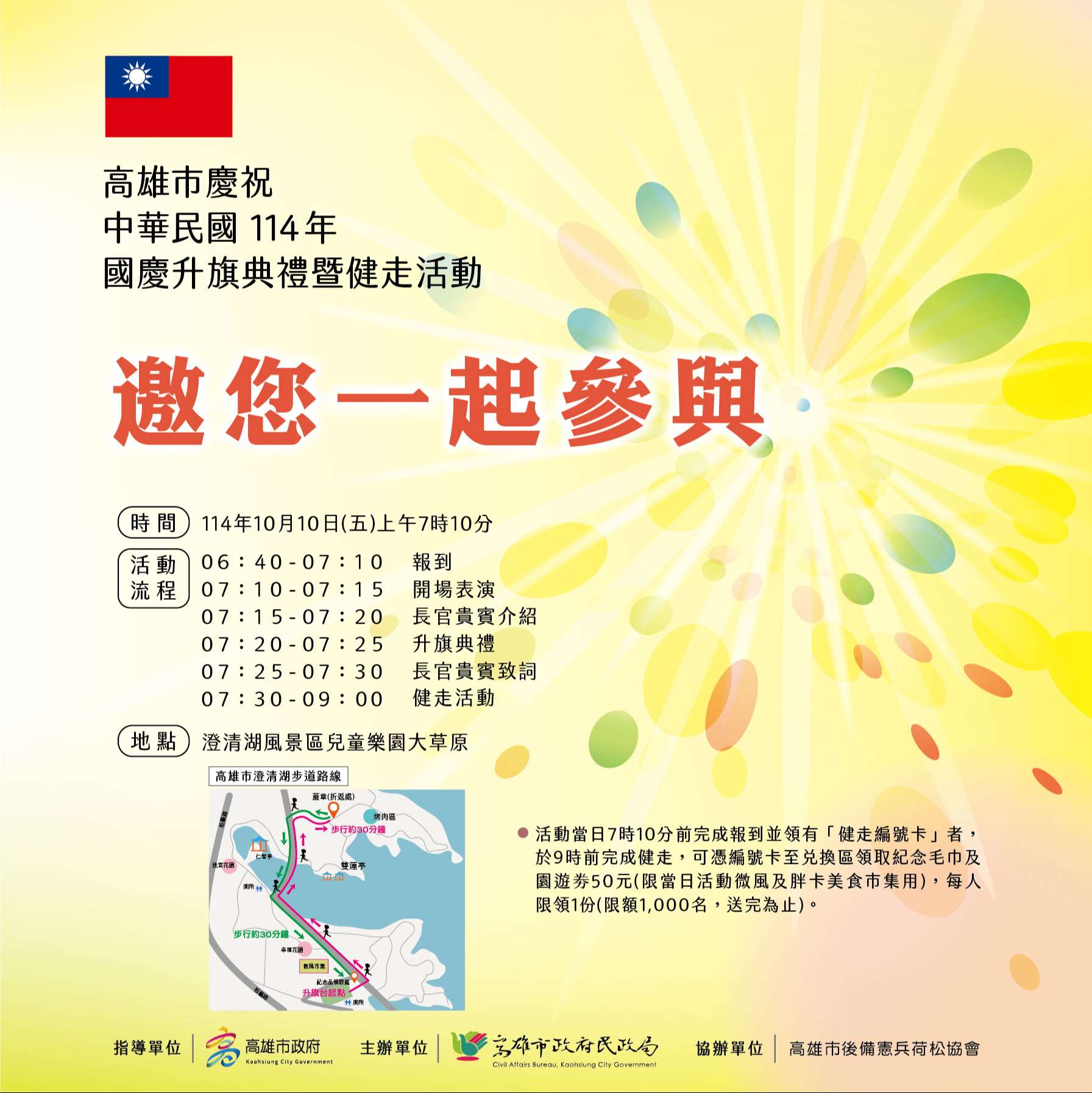 一、依市府114年10月3日高市府民兵字第11471022800號函辦理。二、旨揭活動訂於114年10月10日(星期五)上午7時10分假澄清湖風景區兒童樂園大草原辦理。
