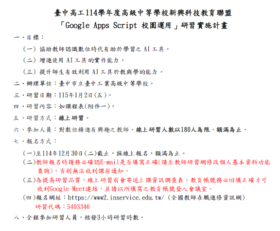 四、活動網址:https://w3.tcivs.tc.edu.tw/ischool/publish_page/244/(臺中高工新興科技推廣中心;可至臺中高工首頁,點選上方相關單位選單進入。)