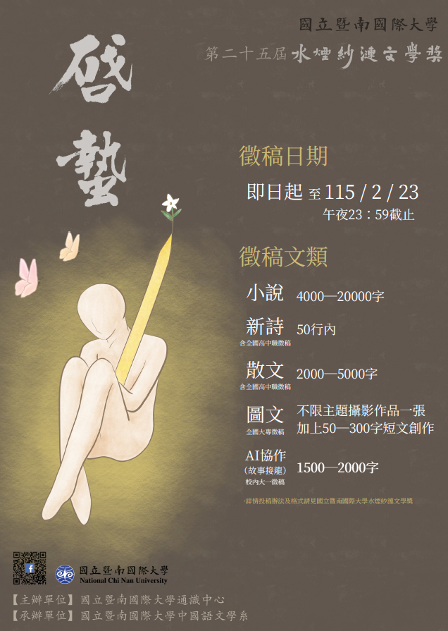 五、收稿方式、格式說明請參閱「水煙紗漣文學獎」臉書(https://www.facebook.com/ncnu.literature)。