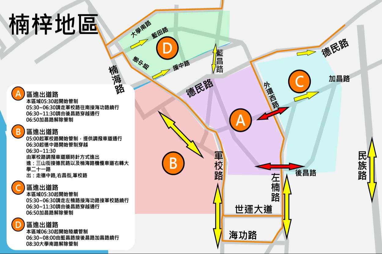 一、旨揭賽事於115年1月11日(星期日)05:30假高雄國家體育場起跑,04:00起陸續實施交通管制。競賽路線途經左營、楠梓區、橋頭區、岡山區、彌陀區及梓官區等行政區,請宣導提早出發或避開競賽路段,並參考當日各路段管制情形。