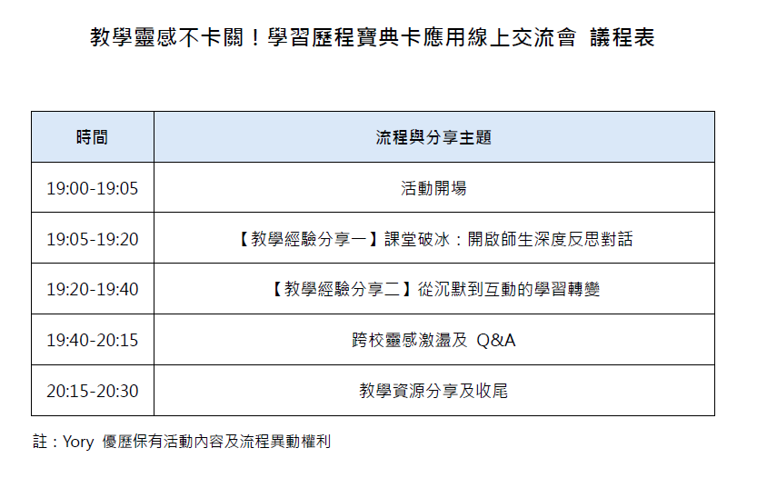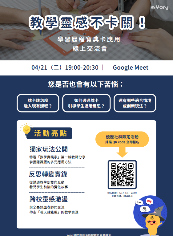 一、為協助教師運用多元工具引導學生進行學習歷程檔案之反思與產出,Yory 優歷先前提供「學習歷程 30 問寶典卡」教具予貴