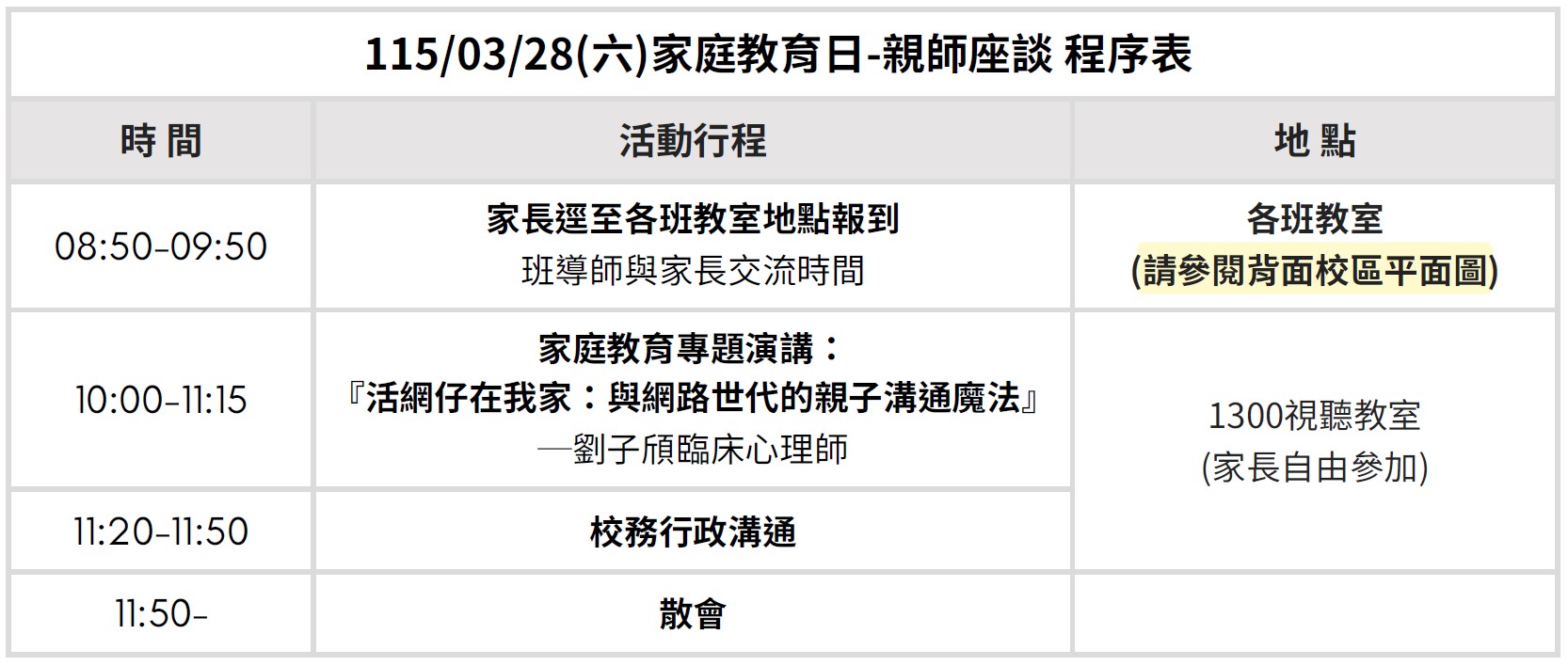 本次家庭日安排有與各班導師座談(地點均在各班教室,教室位置請參閱校區平面圖)、家庭教育專題演講【活網仔在我家:與網路世代的親子溝通魔法】以及校務溝通。為鼓勵貴子弟重視課業與學習,願意積極扮演溝通橋樑,若貴家長來校與會,貴子弟將可獲得嘉獎乙次,以茲鼓勵。