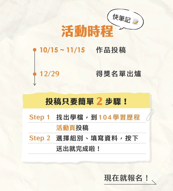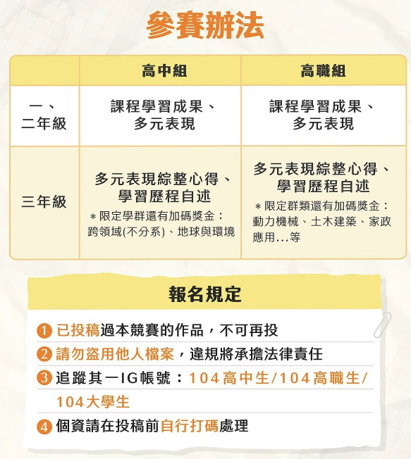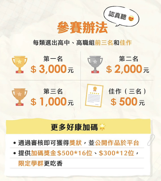 二、內容:邀請全臺高中、職學生投稿,高一至高三皆可參加,不限當年度學習歷程!通過審核的作品將公開於平台,並提供參賽獎狀與獎金。