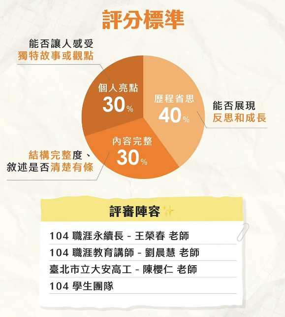 五、評分標準:歷程省思40%、個人亮點30%、內容完整30%。