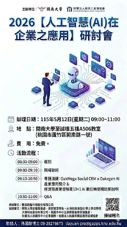 主旨:檢送本校與財團法人資訊工業策進會預計於115/5/12(二)09:00-11:00聯合於開南大學辦理之【2026人工智慧(AI)在企業之應用】研討會海報及網路報名表單資料乙份,惠請鼓勵貴單位人員及所屬會員/廠商踴躍報名參加,參加者惠請給予公假,至紉公誼。