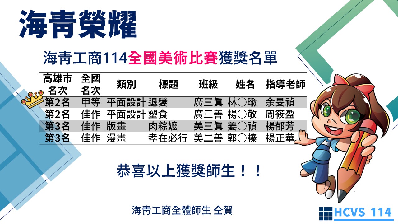 高雄市立海青工商114全國美術比賽獲獎名單: