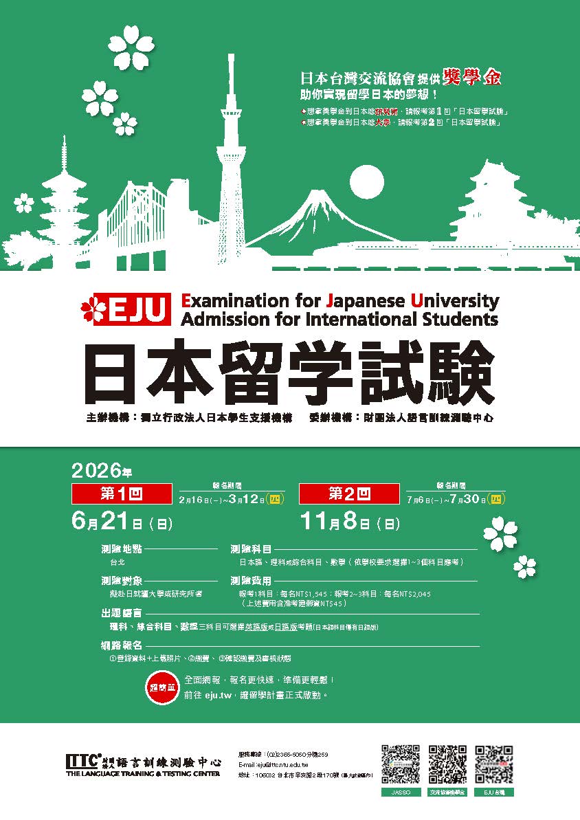 五、「日本台灣交流協會」採用EJU成績作為赴日留學獎學金考試之初試評選標準,擬申請研究所獎學金須報考6月EJU;申請大學獎學金須報考11月EJU。獎學金含學費、生活費、